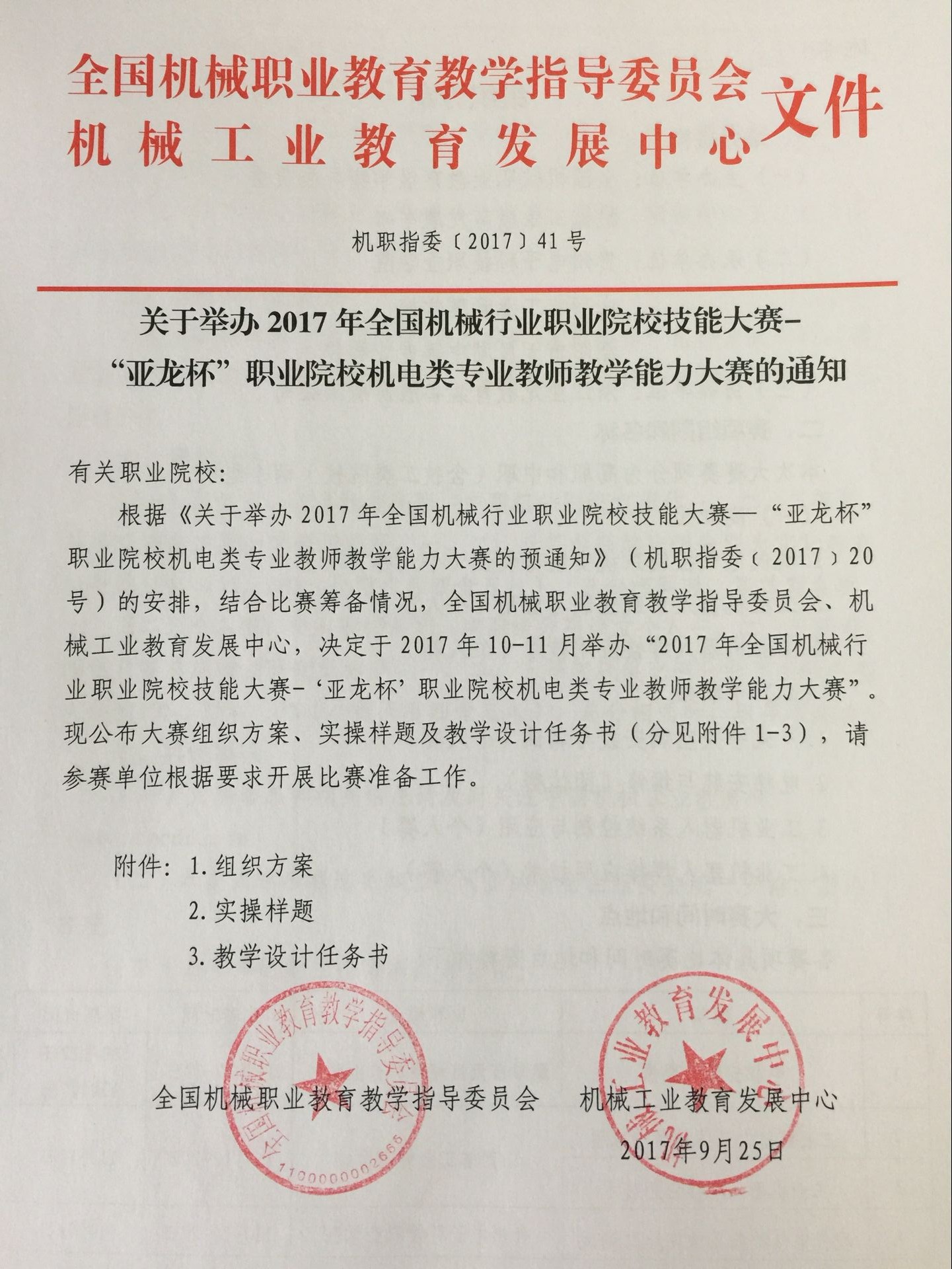 关于举办2017年全国机械行业技能大赛“亚龙杯”职业院校机电类专业教师教学能力大赛的通知